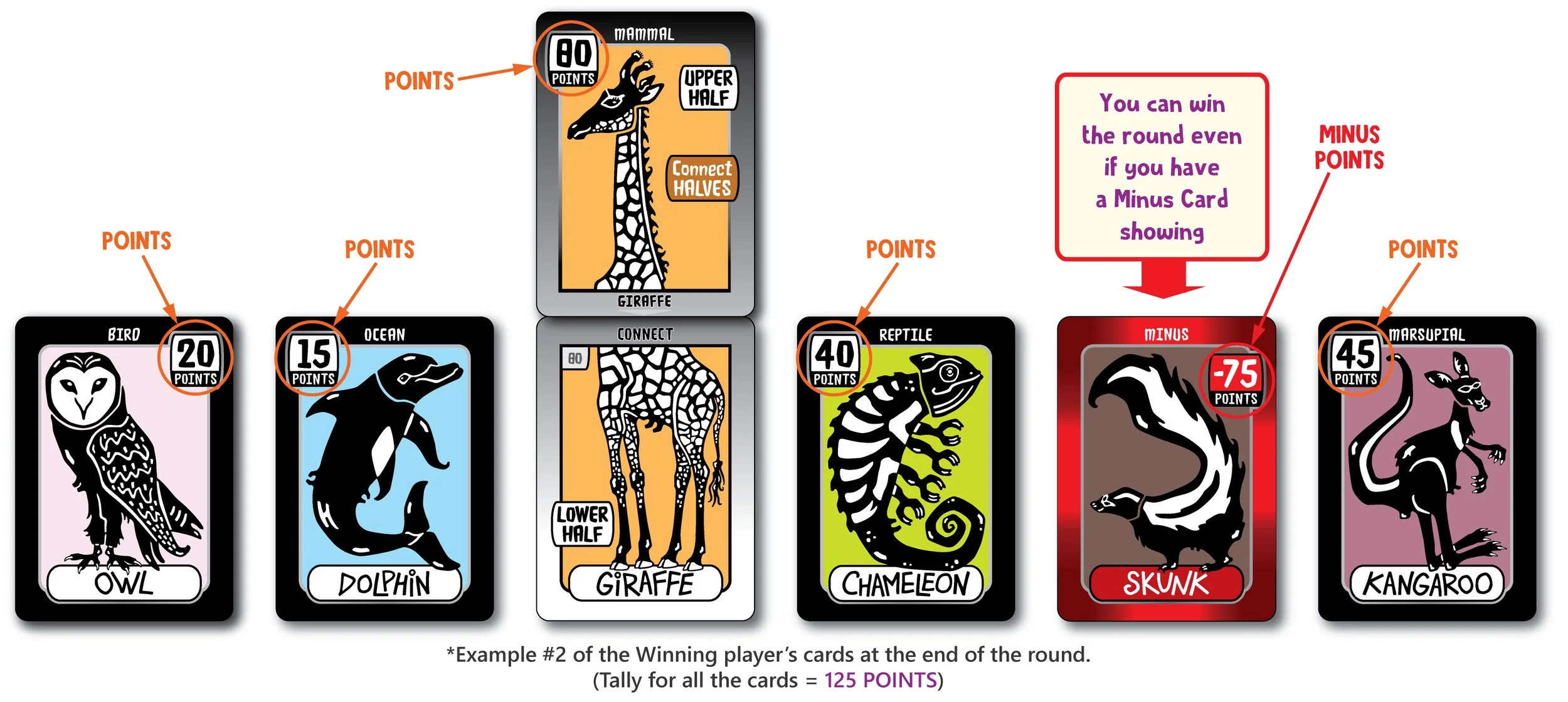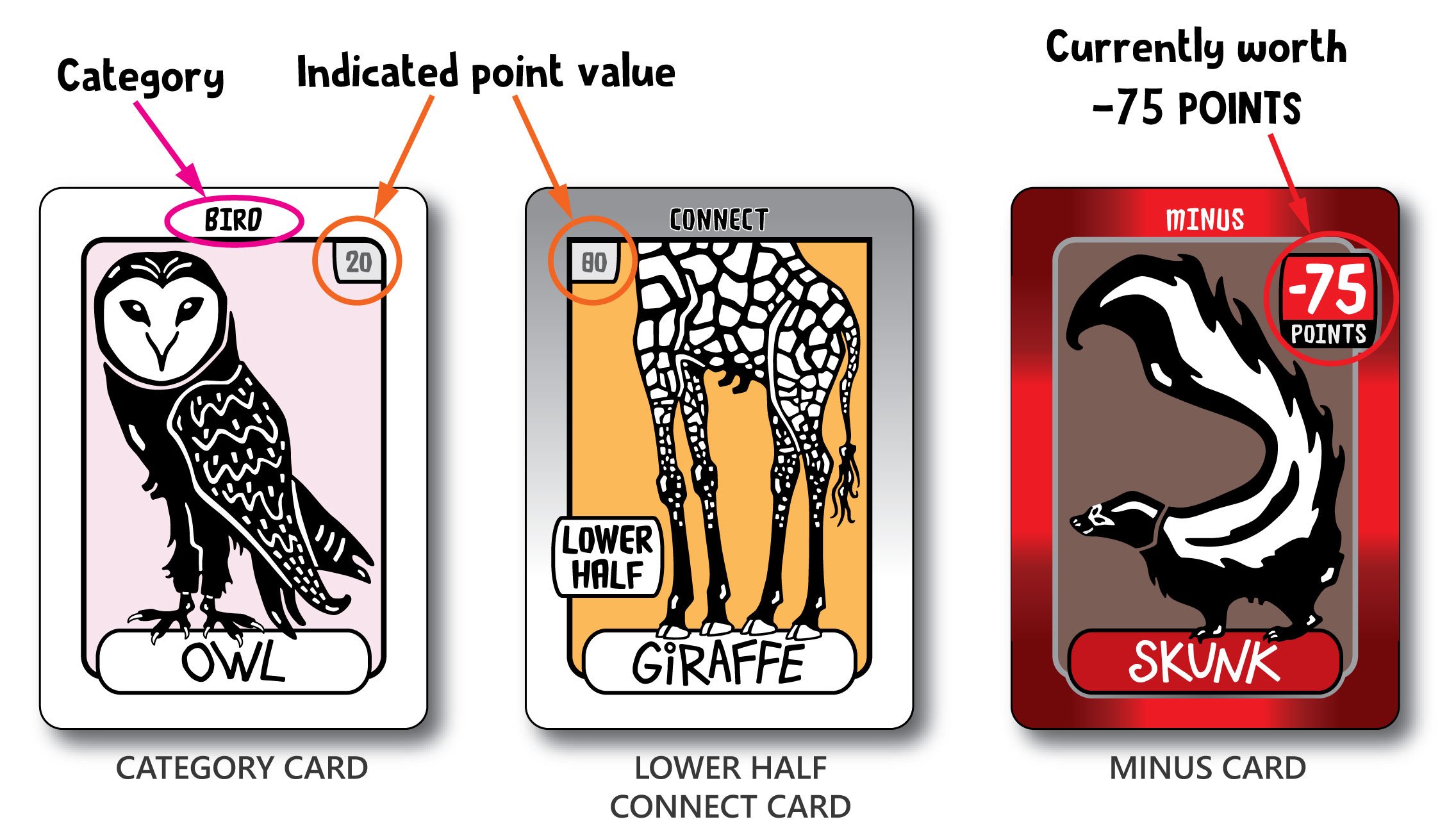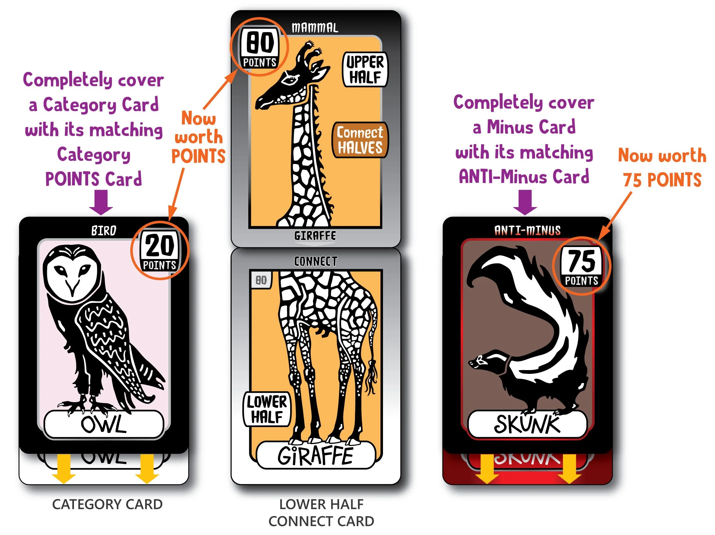 REMEMBER: Only Category Cards and Lower Half Connect Cards are showing indicated point values on them. So, they aren’t showing actual POINTS yet… not until they are covered with their matching animal cards. Minus Cards, however, are always showing actual POINTS (albeit minus points).