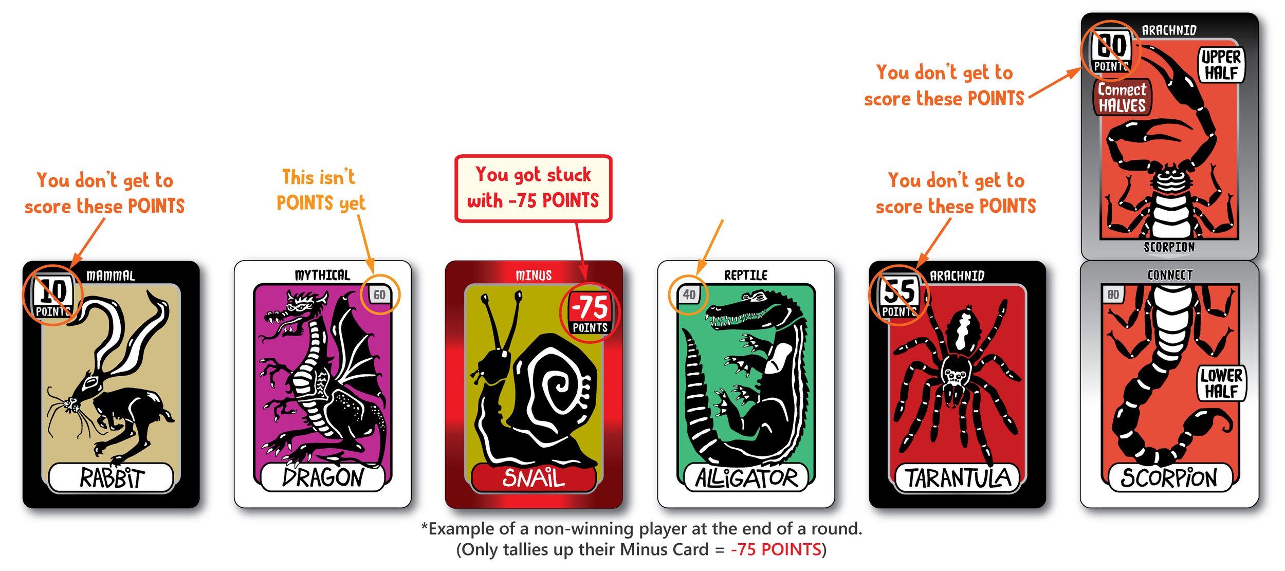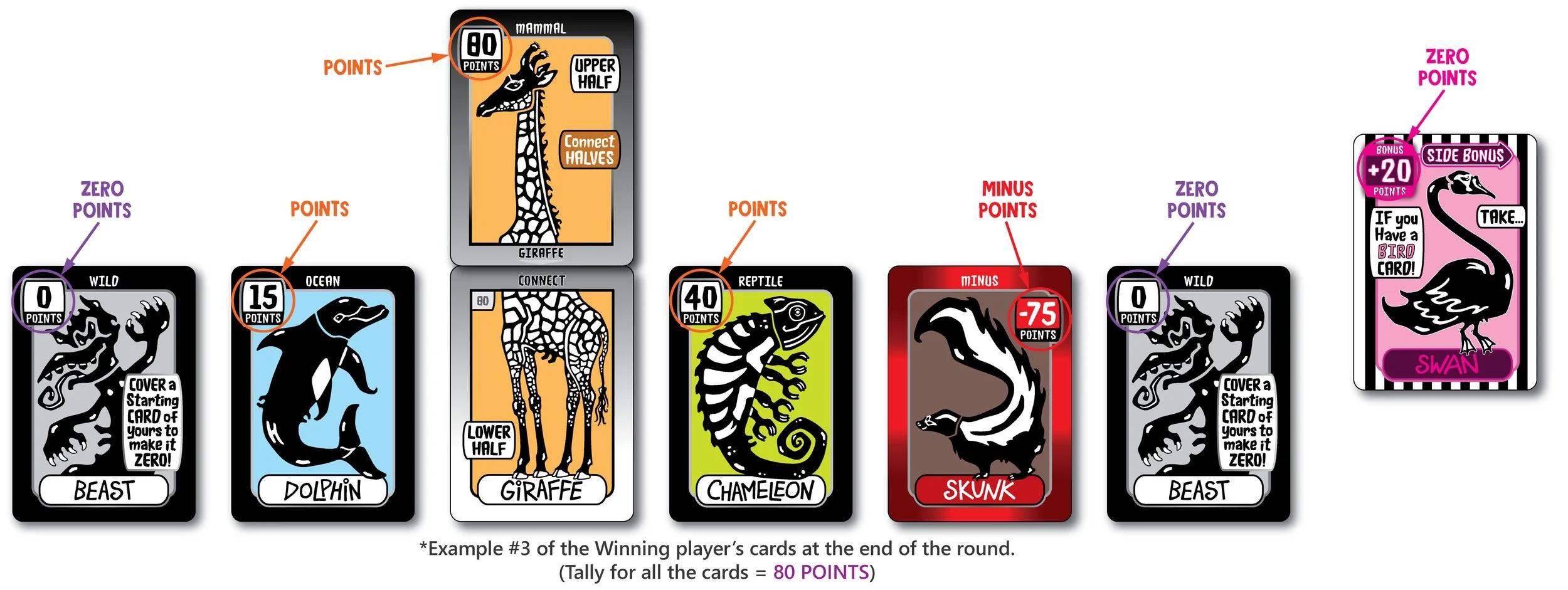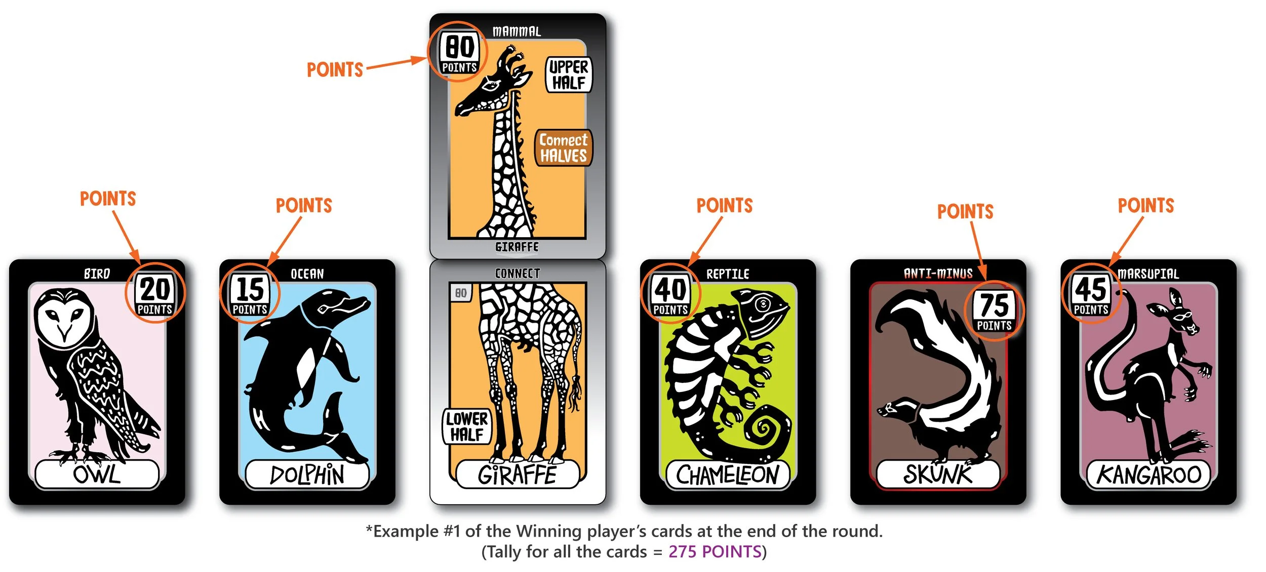 REMEMBER: Only Category Cards and Lower Half Connect Cards are showing indicated point values on them. So, they aren’t showing actual POINTS yet… not until they are covered with their matching animal cards. Minus Cards, however, are always showing actual POINTS (albeit minus points).