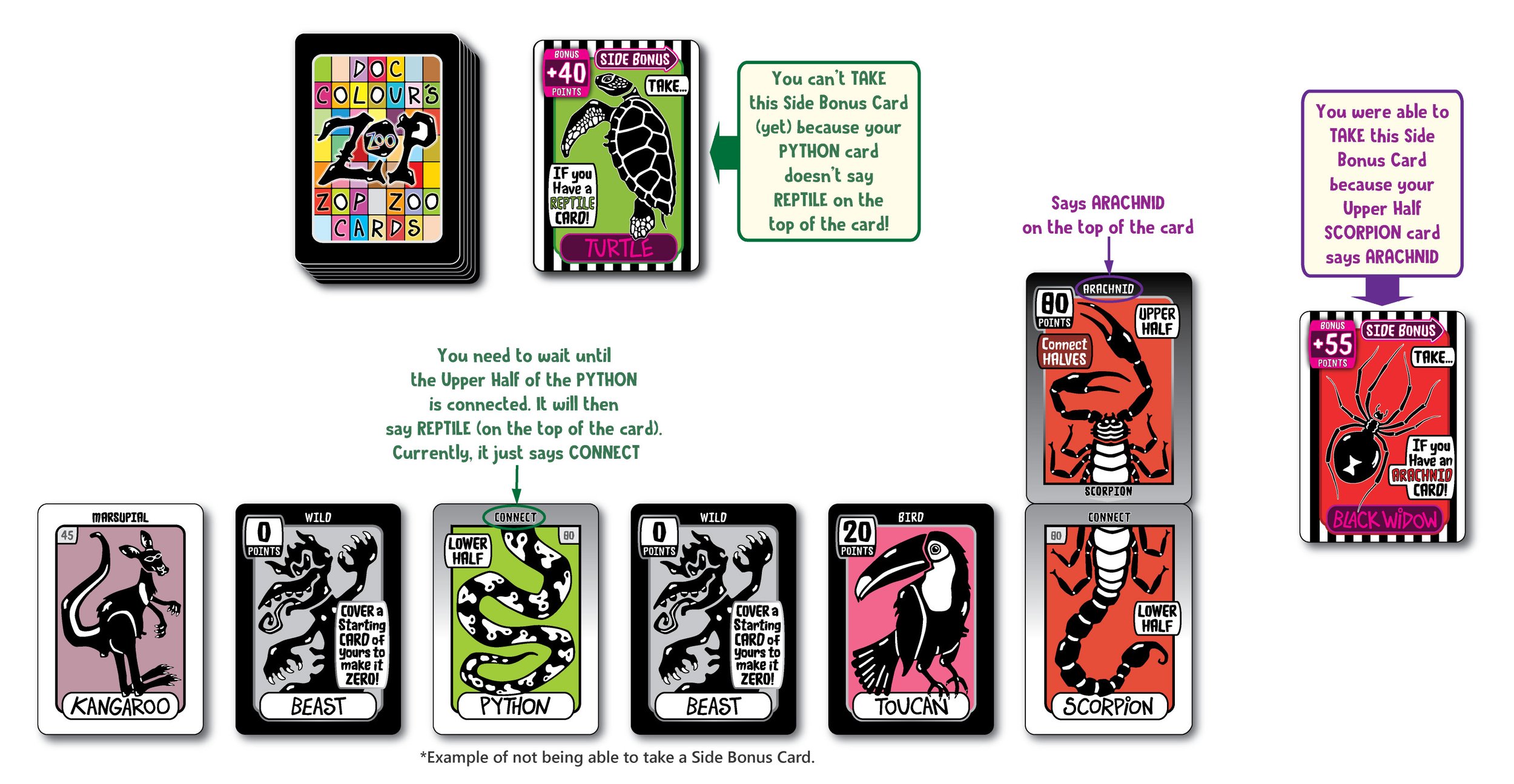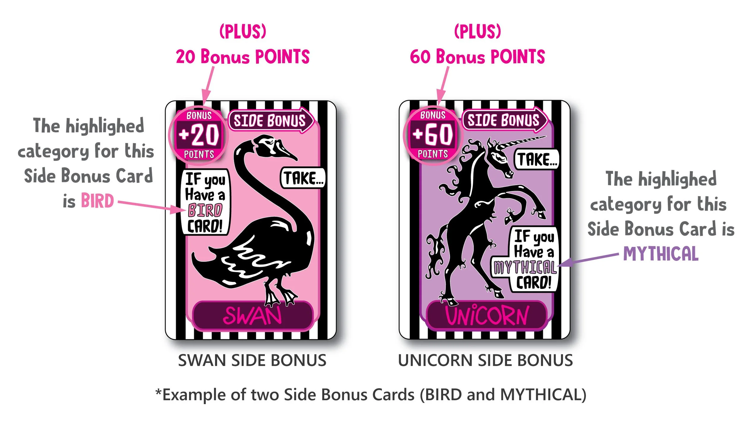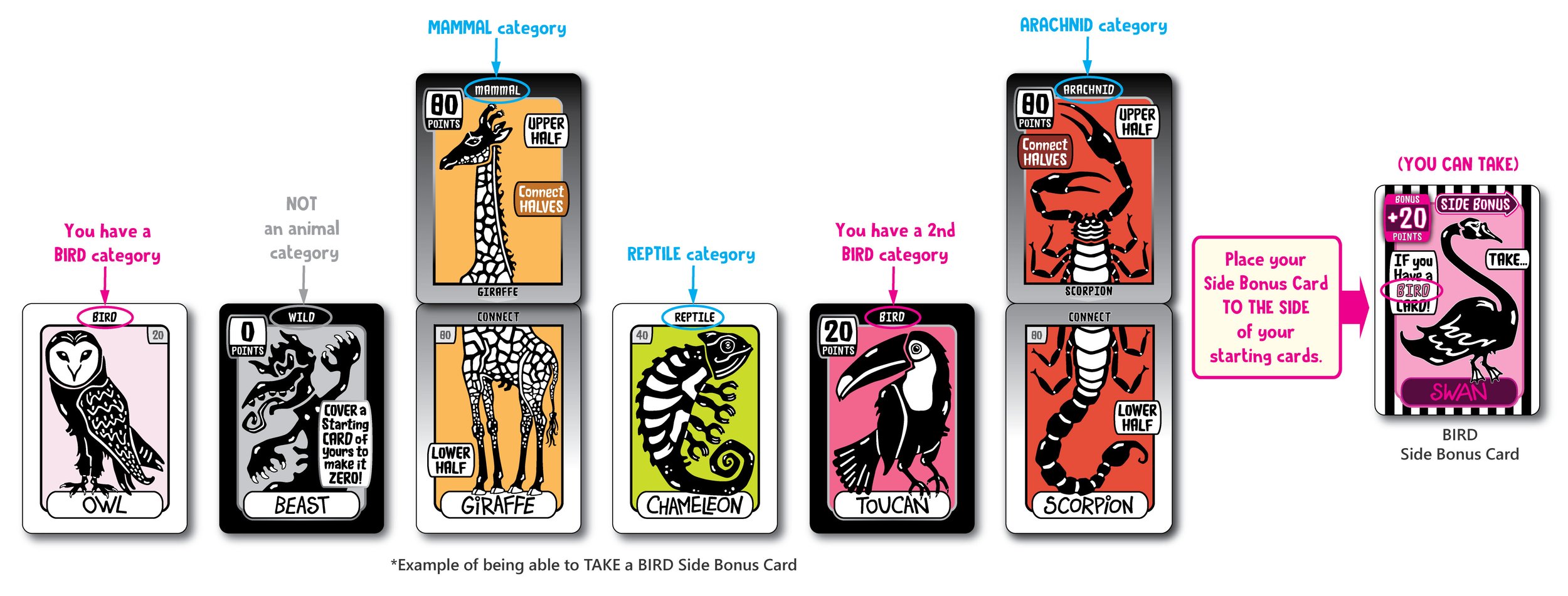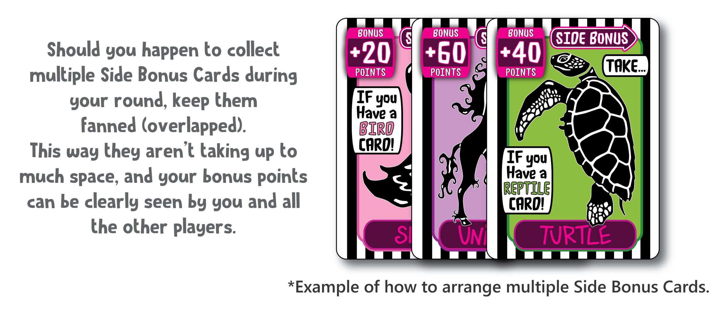 When you pick a Side Bonus card from the draw pile, check the top of your cards to see if any of them match (list) that same specified animal category. If any do, TAKE the Side Bonus Card and place it to the side of your starting cards to be added to your score at the end of the round - draw again. If you can’t match it, discard it. If you take a Side Bonus Card from the discard pile, your turn automatically ends after you place it to the side of your starting cards.