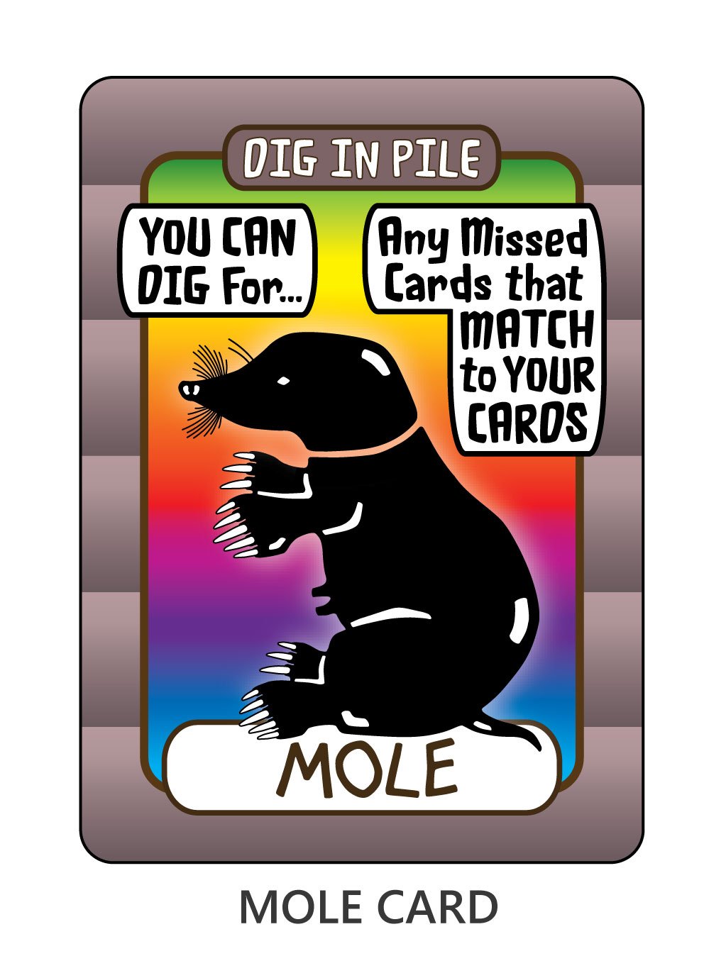 MOLE cards are used to "dig" for your missed cards that get passed up and buried in the discard pile. They allow you to pick up the entire discard pile and scan through the deck to find and take out any matching cards that can cover or connect to any of your starting cards. You can also dig for Side Bonus Cards.