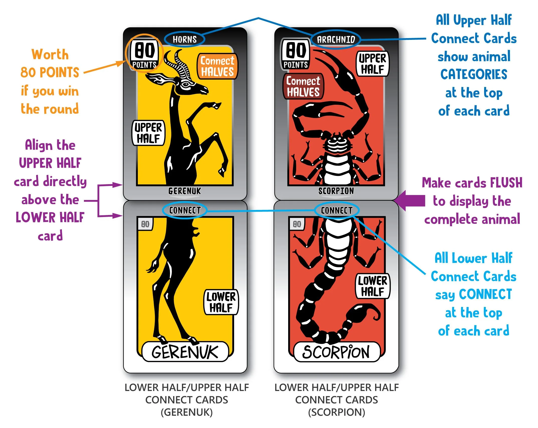 These cards have white-to-gray borders around them. They display only the LOWER HALF of an animal and say CONNECT at the top of each card. All Lower Half Connect Cards have an indicated point value of 80 points listed in upper left or right corner of the card.