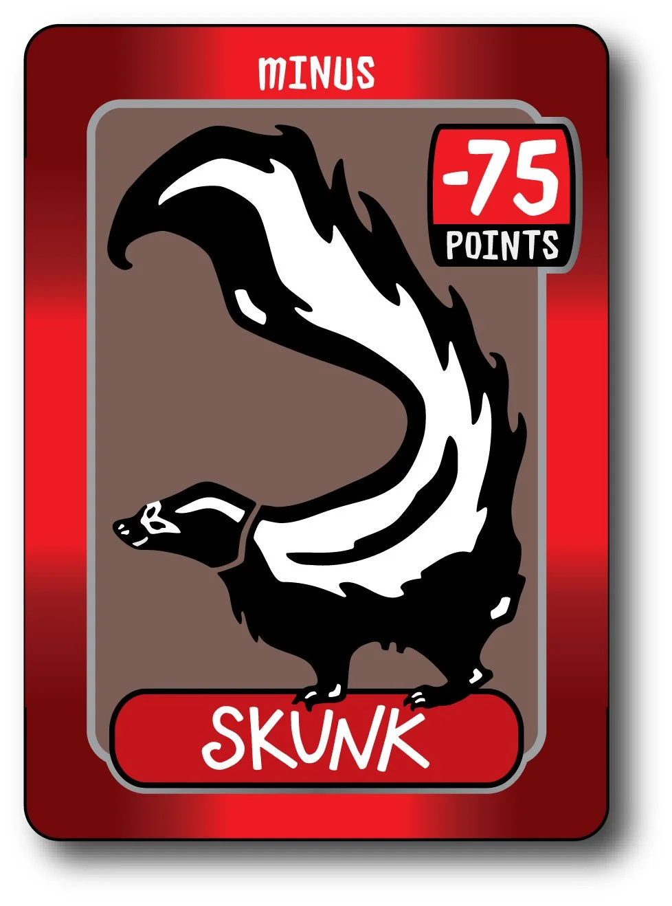 These cards have red-shaded borders around them. They display an animal and say MINUS on the top of each card. They also show minus POINTS in the upper right corner of the card.